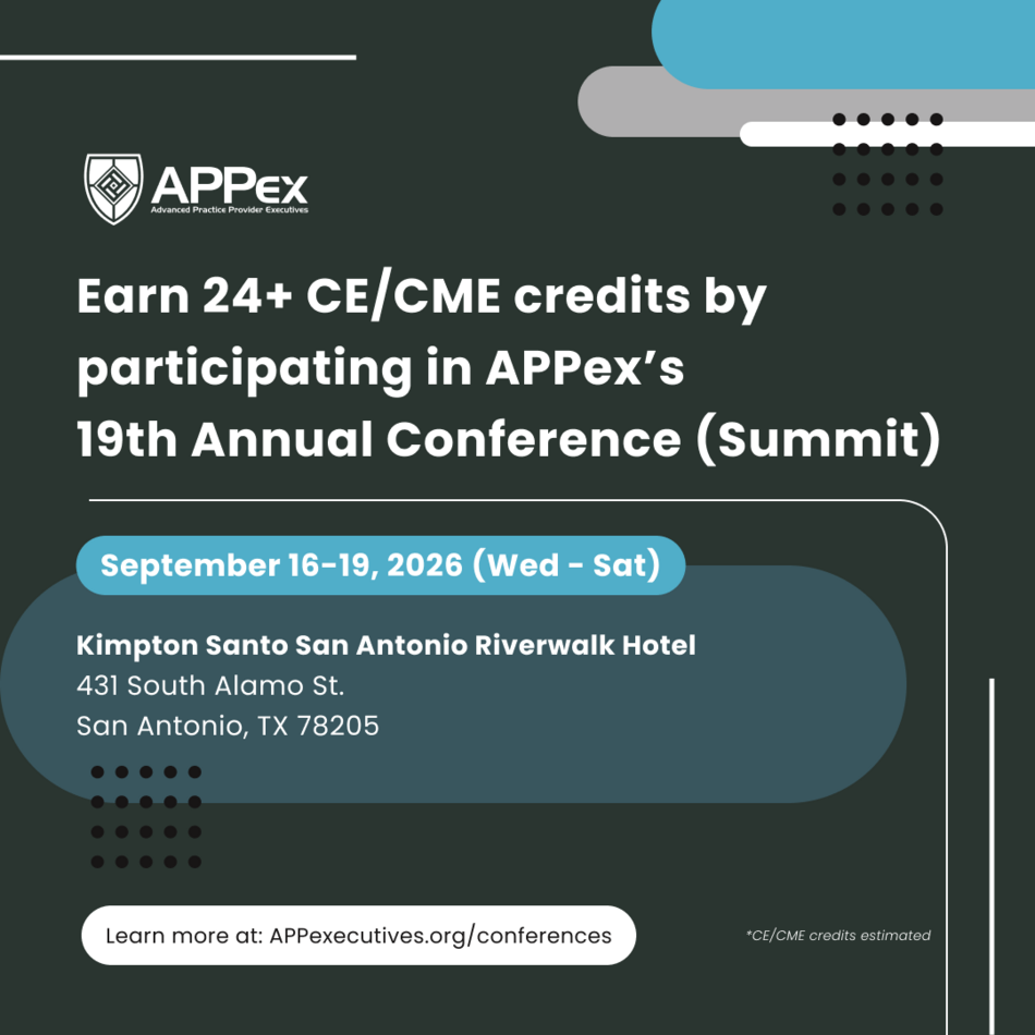 APPex’s annual conference held in September--the Advanced Practice Provider (APRN & PA) Leadership Summit--is the first and largest conference specifically geared towards advanced practice leadership and administrative topics.