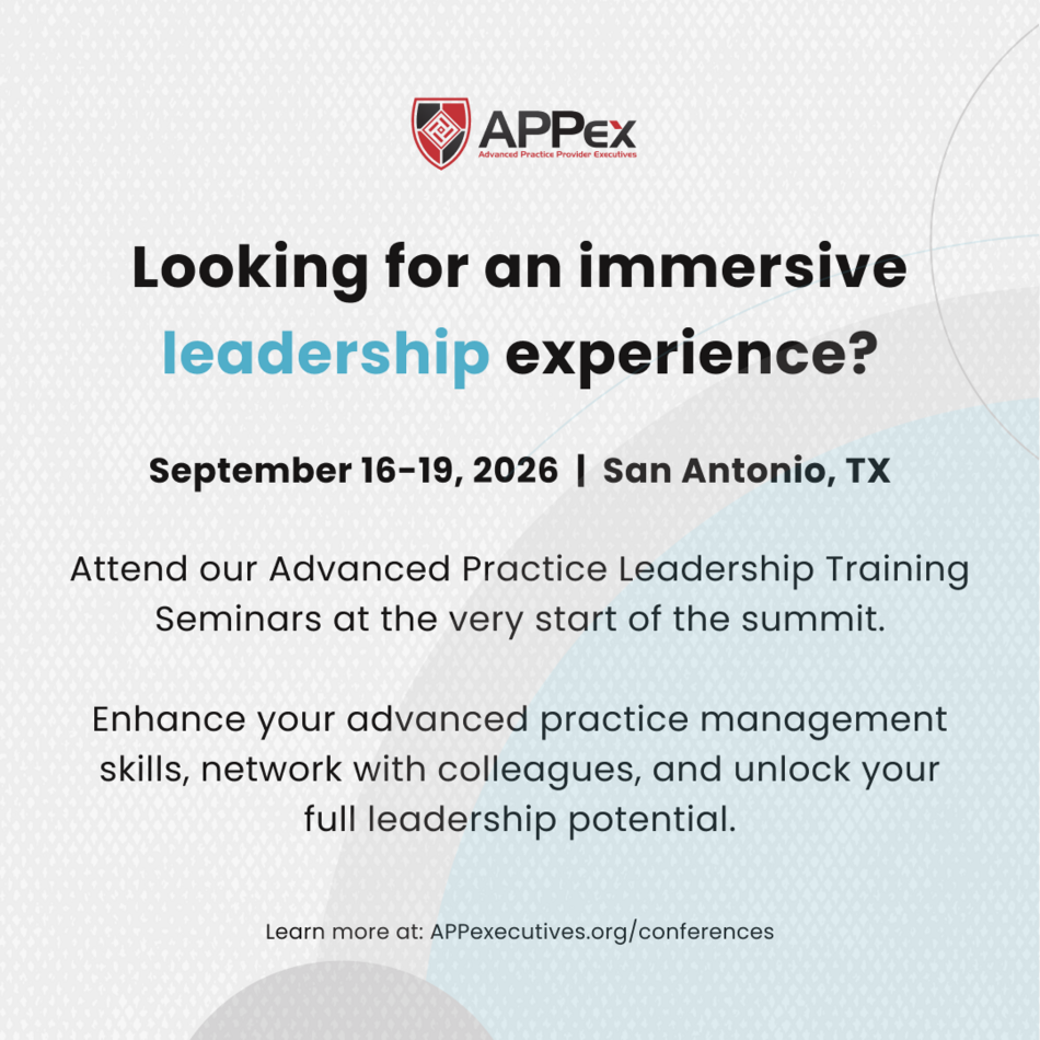 APPex’s annual conference held in September--the Advanced Practice Provider (APRN & PA) Leadership Summit--is the first and largest conference specifically geared towards advanced practice leadership and administrative topics.